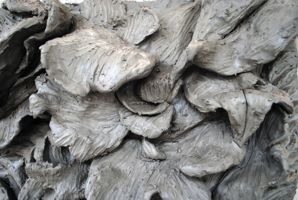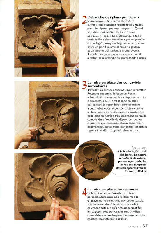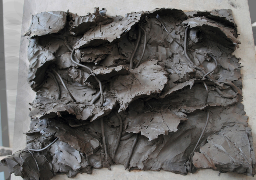 Vous pouvez préparer les feuilles séparément, puis les « coller » au fond comme l'exemple ci-dessous. Pour lier les reliefs et les fonds en un ensemble solide et cohérent, il faudrait rajouter des épaisseurs par ajouts de matière (voir chapitre 11 « concave/convexe » cluzet) en veillant à mettre en correspondance les points les plus hauts. Pour l'instant, il manque l'impression de densité propre à cette technique, c'est-à-dire l'appartenance au mur. La seconde correction possible passe par une manipulation déplaisante pour l'étudiant : on prend la planche, on l'écrase face contre le sol puis on la repose sur la sellette. (voir chapitre 17 « médaillon » bichon 5). Le plan obtenu devient l'équivalent du mur dans lequel le sculpteur ornemaniste doit inscrire ses motifs.